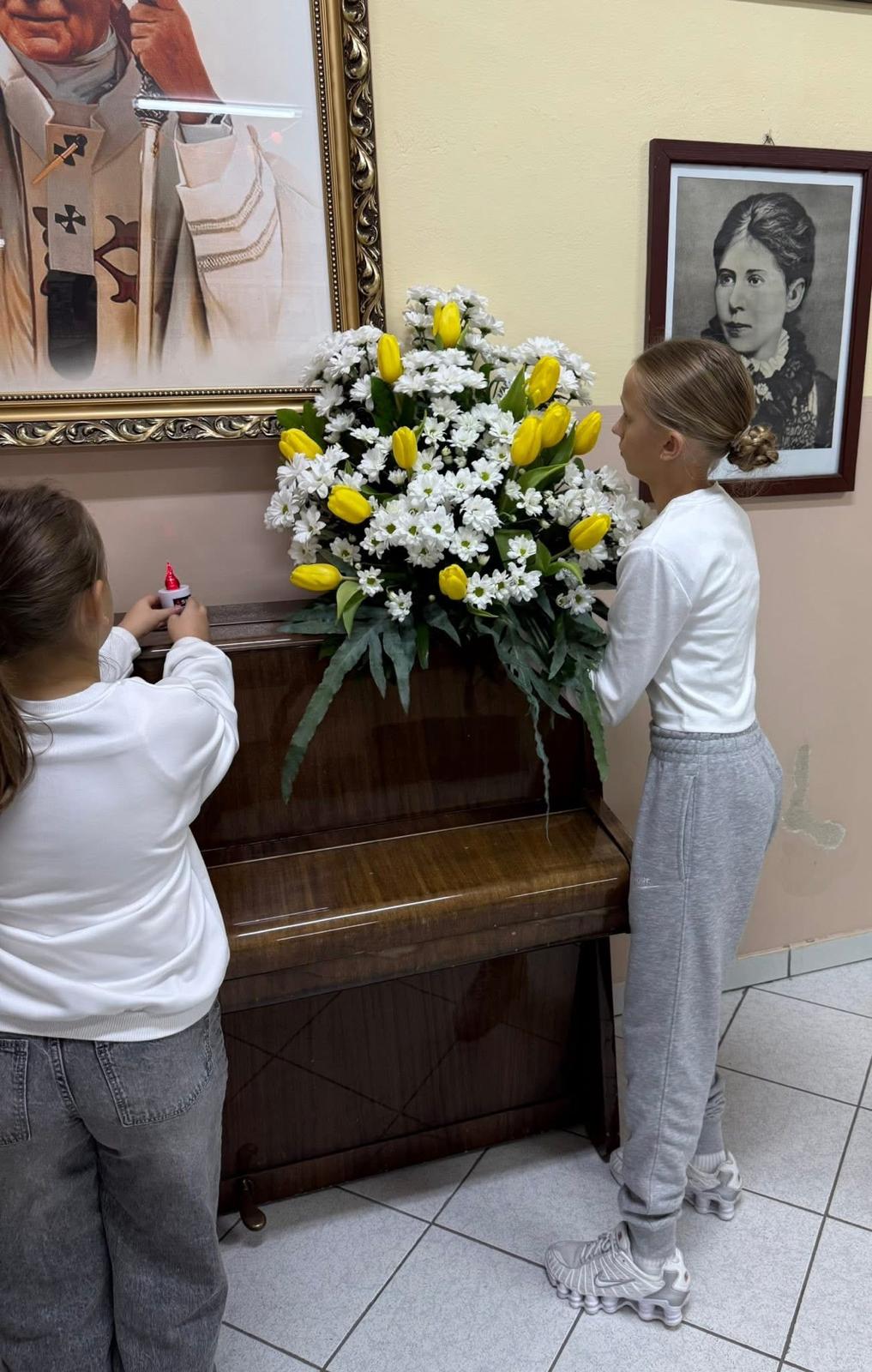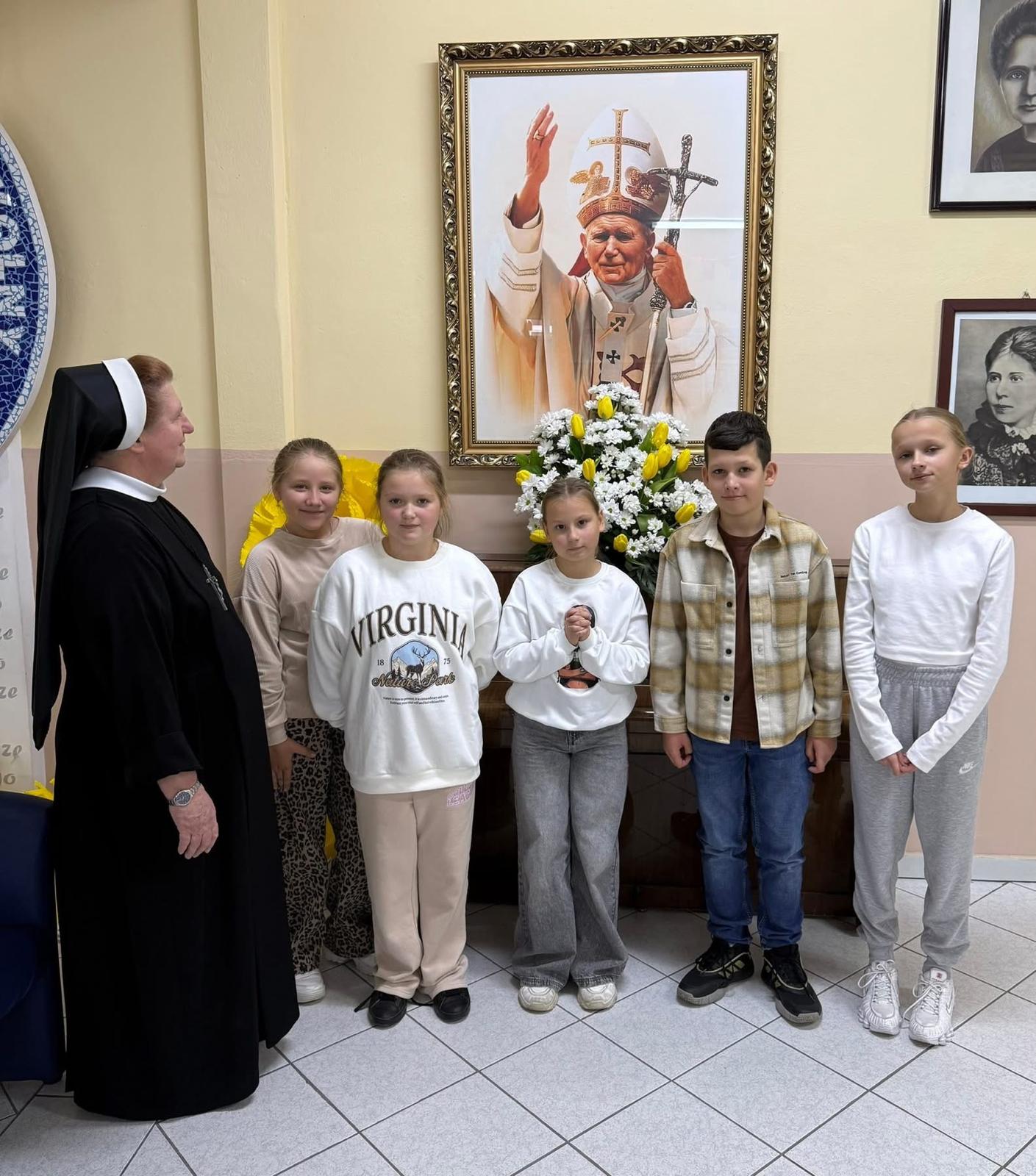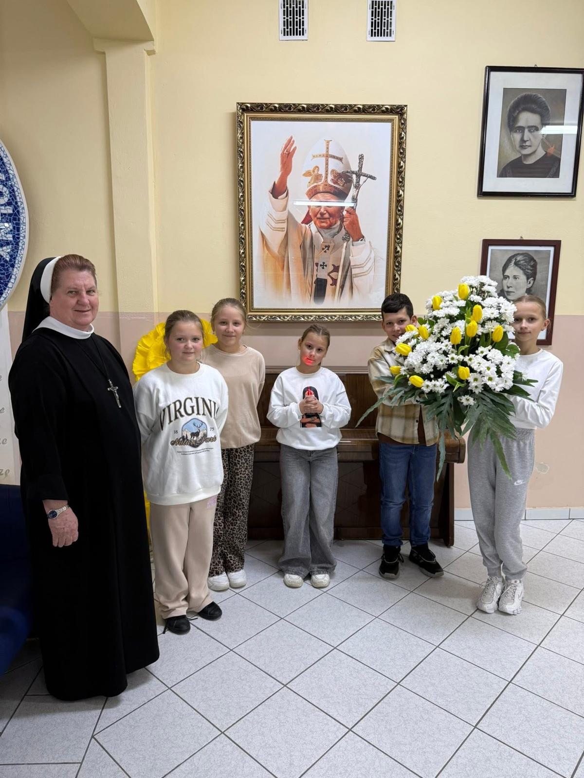 Dzień Papieża Jana Pawła II obchodzony jest co roku 16 października. Dziś uczniowie naszej szkoły, aby upamiętnić ten wyjątkowy dzień razem z Siostrą Justyną i Panią Dyrektor Eweliną Szwec po krótkiej, wspólnej modlitwie złożyli kwiaty pod tablicą pamiątkową naszego patrona🤍💛…miłym elementem tego dnia były słodkie kremówki o które postarała się nasza Siostra😊🤍💛 Dziękujemy Siostro Justyna Karaś🤍💛