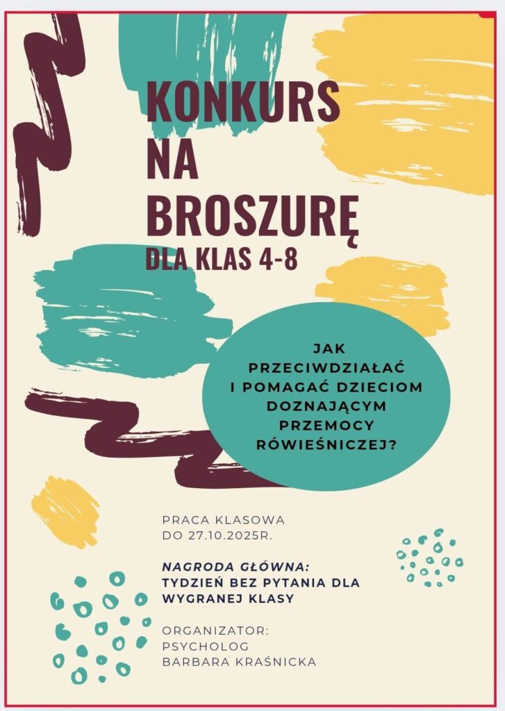 W dniu dzisiejszym przez Panią Barbarę Kraśnicką naszą psycholog, został ogłoszony konkurs profilaktyczny dla klas 4-8 pt. „Jak przeciwdziałać i pomagać dzieciom doznającym przemocy rówieśniczej?”