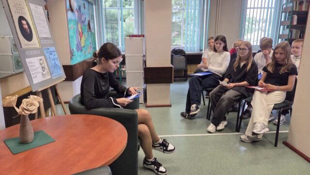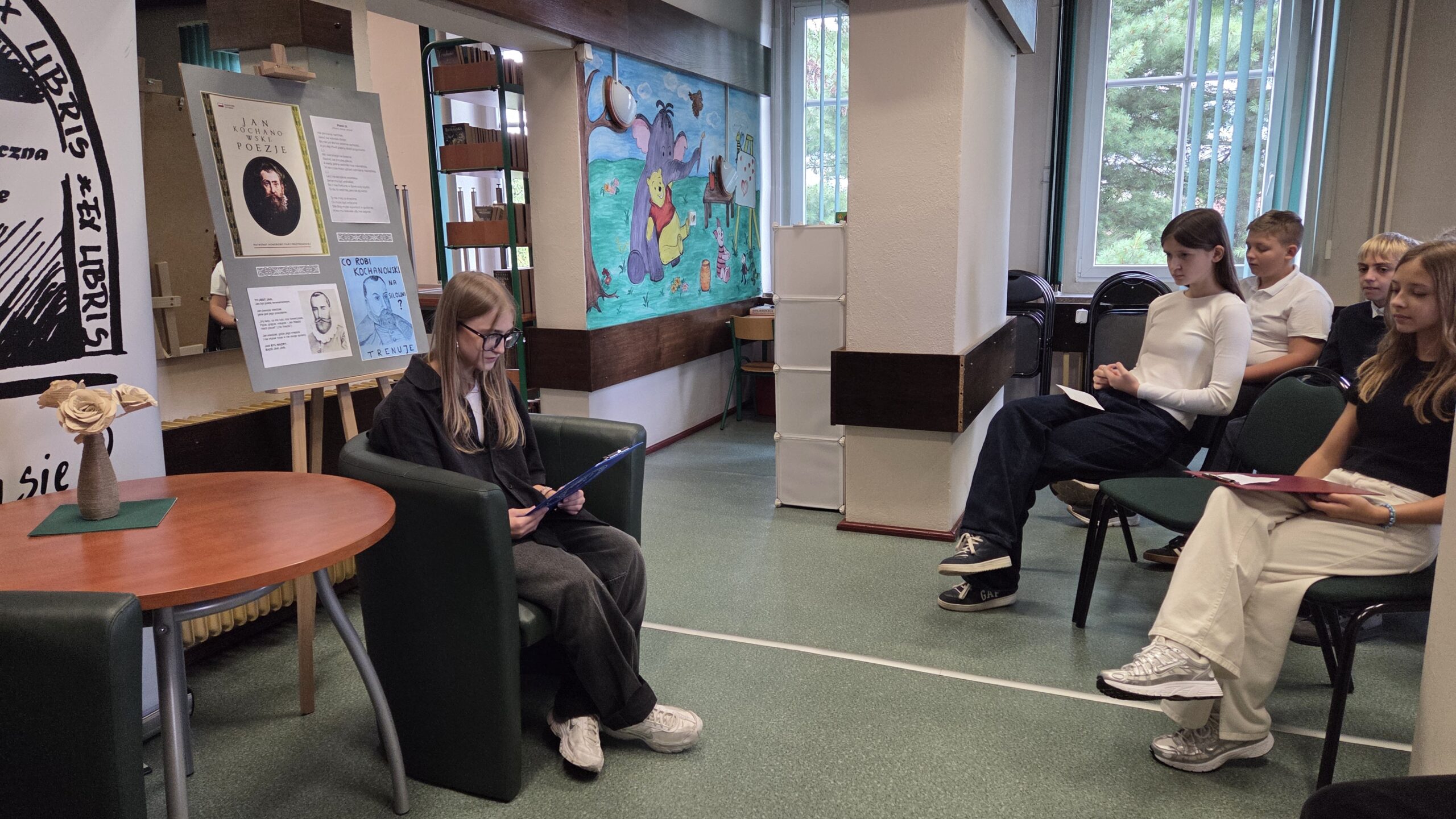 Podczas tegorocznej akcji Narodowego Czytania w całej Polsce sięgamy po dzieła Jana Kochanowskiego 📖📖. Uczniowie klasy 7b dzięki zaproszeniu p. Ewy Ratuś, Dyrektor Biblioteki Miejskiej odkrywali piękno poezji mistrza Jana, zanurzając się w wyjątkowej atmosferze wspólnego czytania. Dziękujemy za zaproszenie i przybliżenie postaci renesansowego poety i jego twórczości 🙂