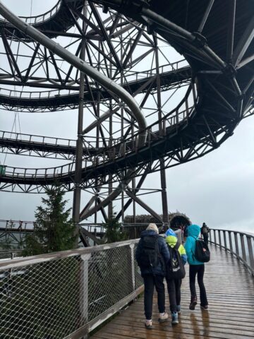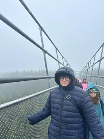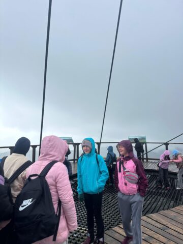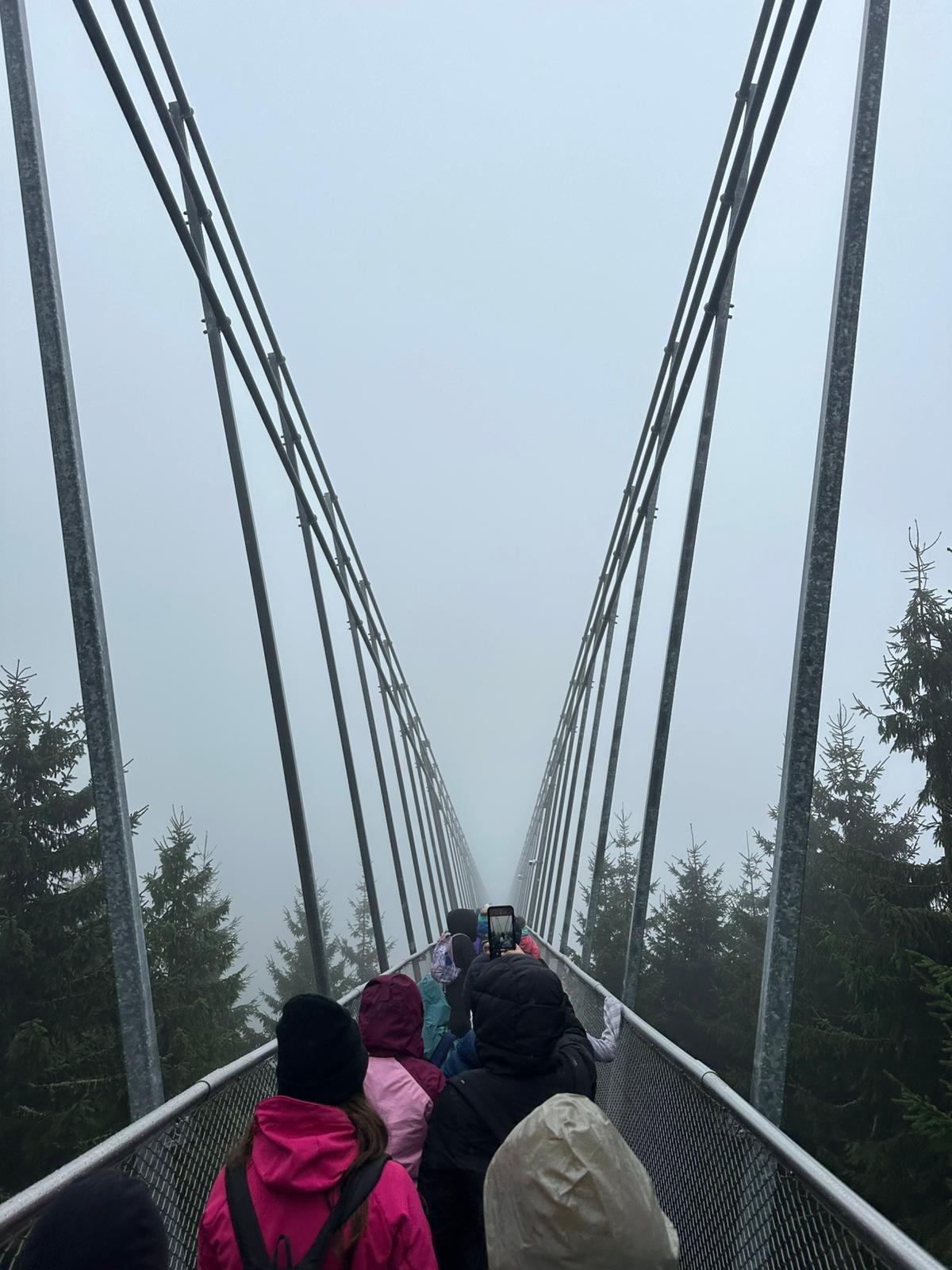 Na miejsce dotarliśmy kolejką linową, a następnie ruszyliśmy pieszo w kierunku mostu. Przejście przez najdłuższy most wiszący w Europie w gęstej mgle i lekkim deszczu to coś, czego długo nie zapomnimy! 🌧🌧 Po przerwie obiadowej, rozgrzani i najedzeni, ruszyliśmy w górę, tym razem na Ścieżkę w obłokach.☁⛅ I chociaż nazwa dosłownie oddawała warunki pogodowe, widoki były niesamowite. 🌄
