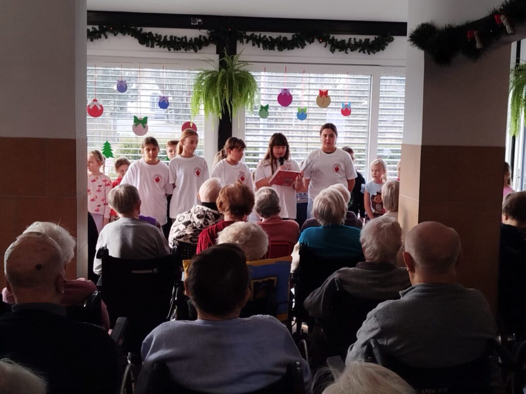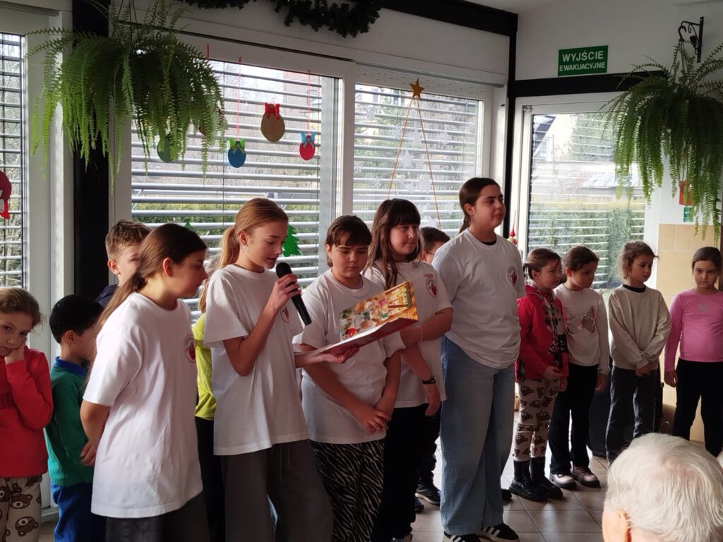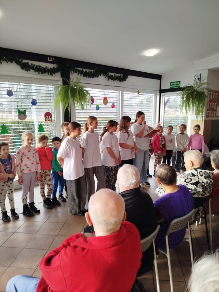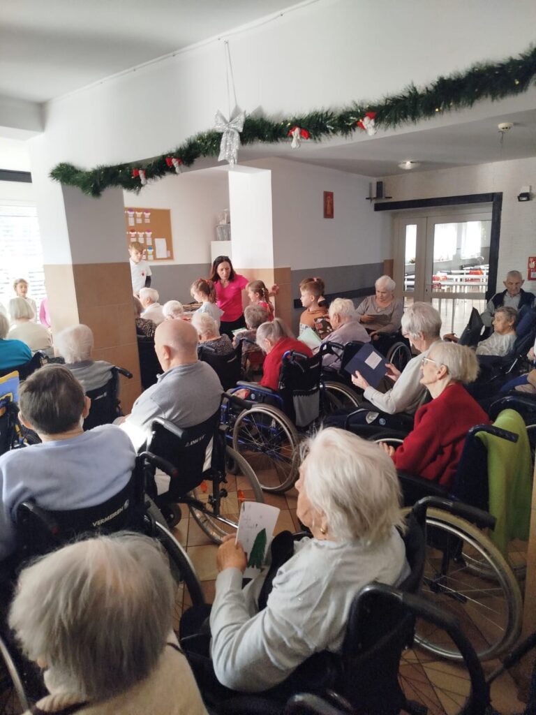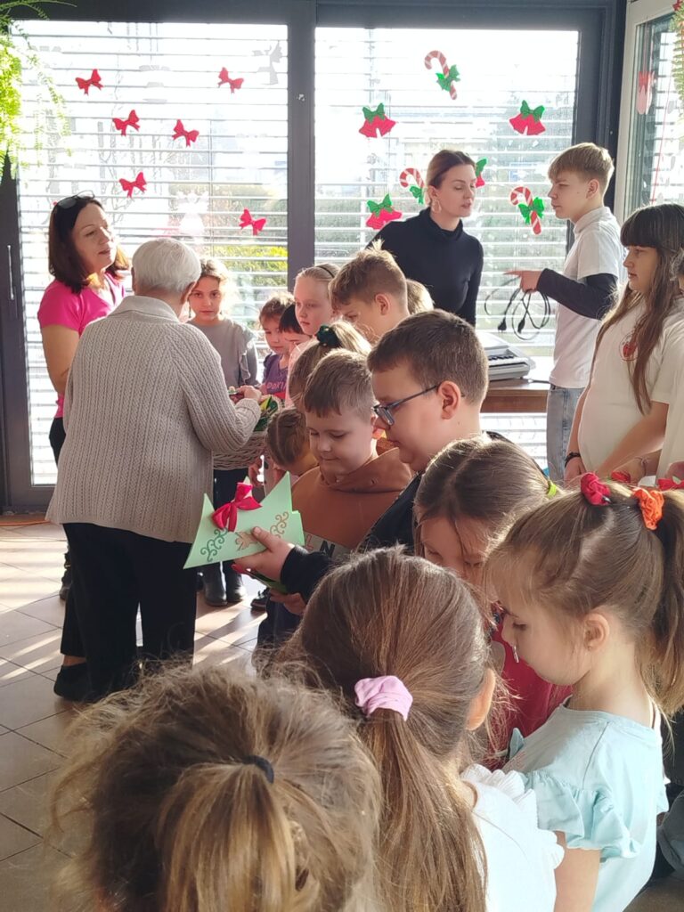 W dniu dzisiejszym wolontariusze❤️ z uczniami klasy 1a udali się do seniorów z domu „Spokojna Przystań”🫶 Mieszkańcy już kolejny rok oczekują na naszych uczniów umilających im przedświąteczny czas🎄🌟Wspólnie pośpiewaliśmy kolędy🎶 przy akompaniamencie pani Ani Dawidów. Uczniowie podarowali życzenia świąteczne w pięknych wykonanych przez siebie kartkach świątecznych⭐️🎄.